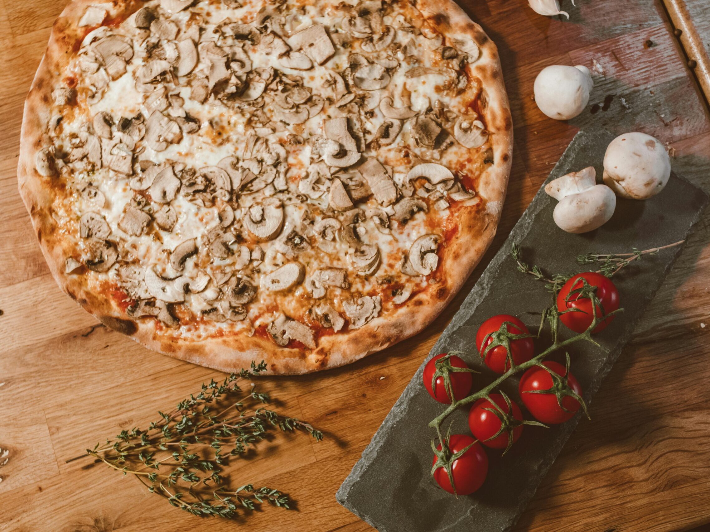 Mushroom pizza is a satisfying vegetarian main course that needs nothing else alongside it beyond a simple green salad. Serve on a wooden board with a drizzle of good quality extra virgin olive oil and a scattering of fresh thyme leaves. A glass of earthy red wine such as a Pinot Noir complements the mushroom flavours particularly well. For a dinner party serve alongside the other pizzas in this collection as a vegetarian option. The earthy, umami-rich flavour of mushroom pizza is often more popular with meat-eaters than any topping they might have expected to prefer.
